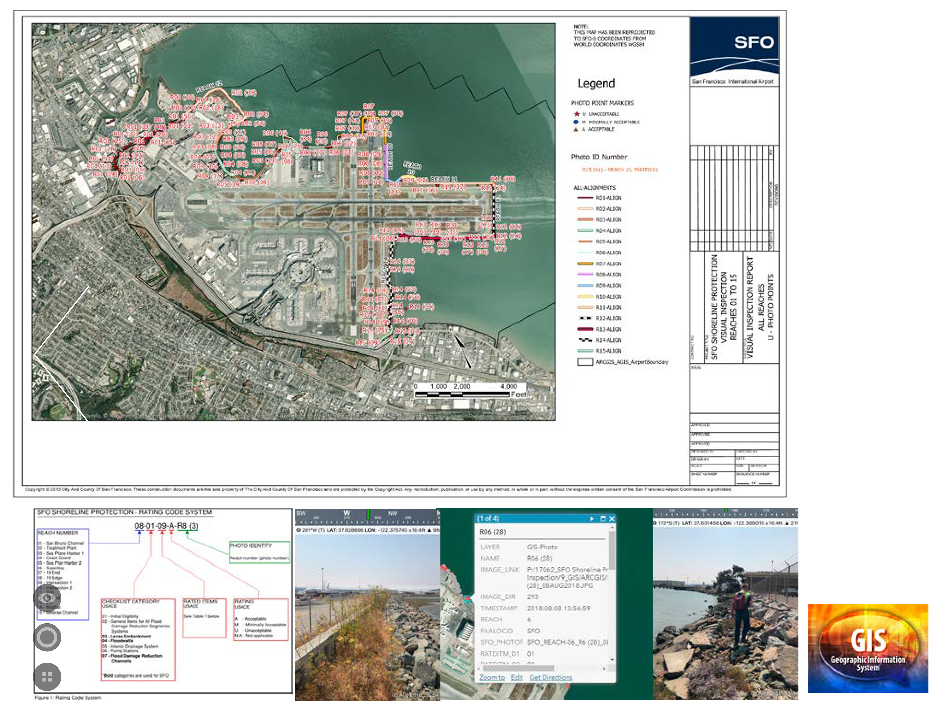 SFO Shoreline Seawall Inspection - Photo documentation located via GIS Shapefile Points. Ratings follow USACE categorization system. ArcGIS Pro was used for the GIS system.